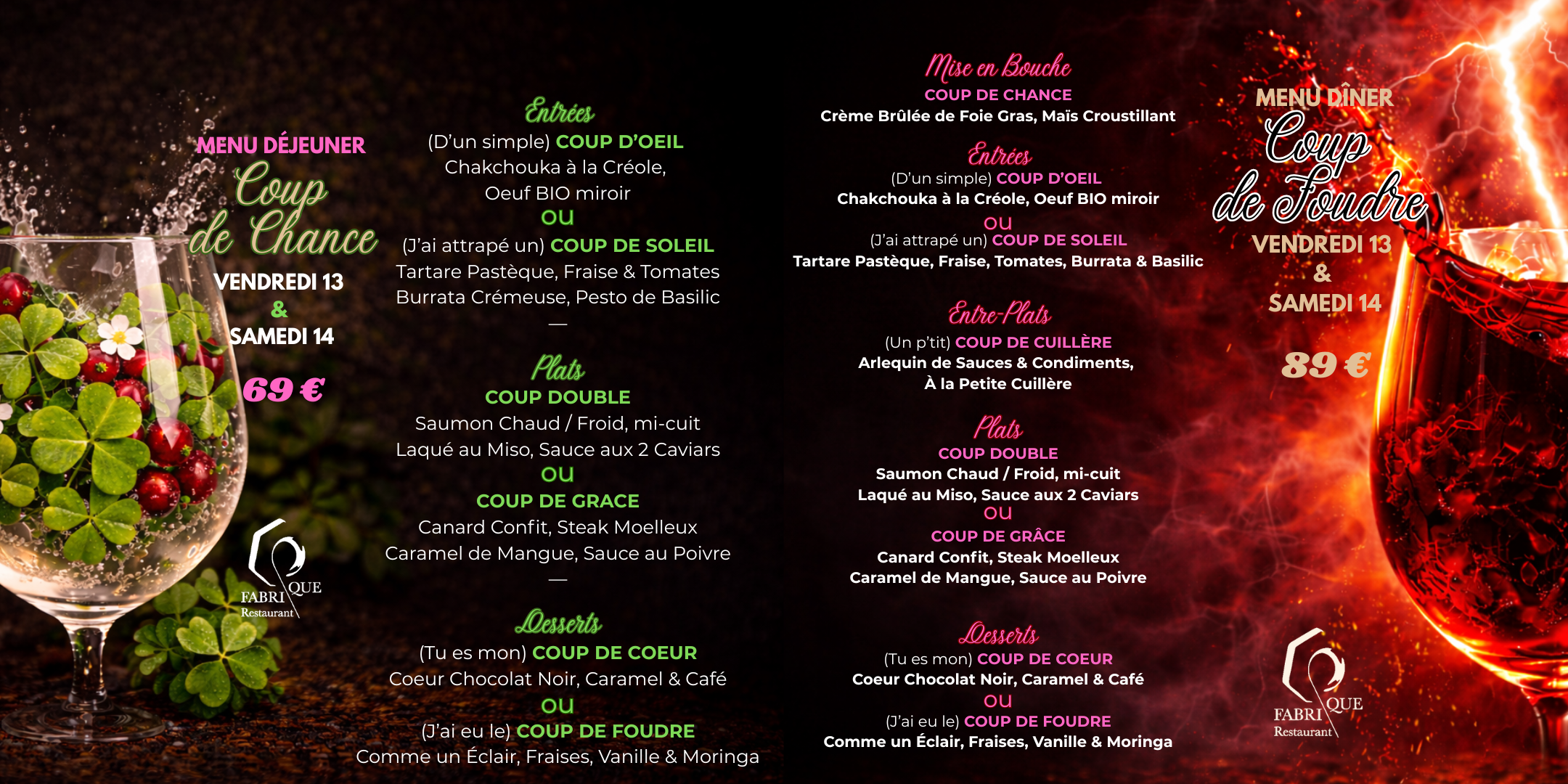 Que vous choisissiez le coup de chance du déjeuner ou le coup de foudre du dîner, ces menus ont été pensés comme :